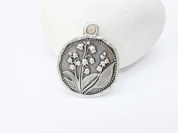 Antique silver plated lily flower charm featuring an elegant botanical floral design with sculpted petals and slender leaves, set on a softly textu...