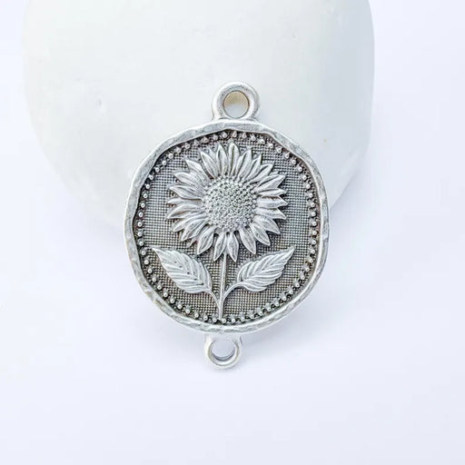 Antique silver plated Sunflower Connector Charm, featuring a detailed sunflower design with two loops for versatile use, perfect for bracelets, nec...