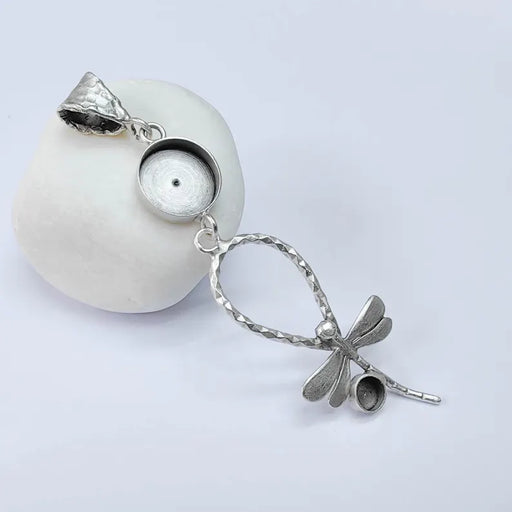 View full detailsDragonfly Pendant with 14mm Round Bezel, Hammered Frame, Antique Silver Plated Brass 92x24mm G37574