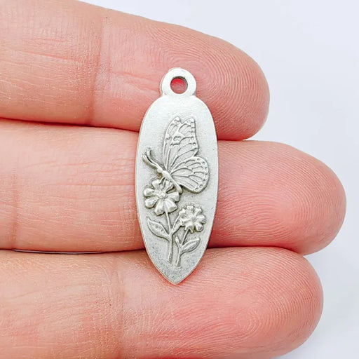 Antique silver plated butterfly and flower charm featuring a finely detailed nature-inspired design on both sides. This elongated oval pendant comb...