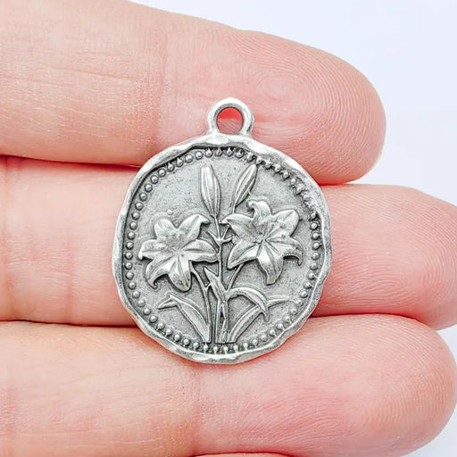 Antique silver plated lily flower charm featuring a detailed botanical design on both sides. This round pendant showcases elegant lily blooms frame...