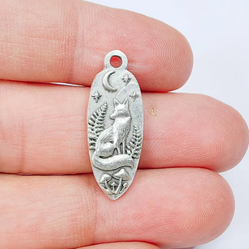 Antique silver plated fox charm featuring a detailed woodland night scene design on both sides. This elongated pendant showcases a sitting fox surr...