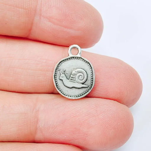 Antique silver plated snail charm featuring a detailed nature-inspired design on both sides. This small round pendant showcases a delicate snail wi...