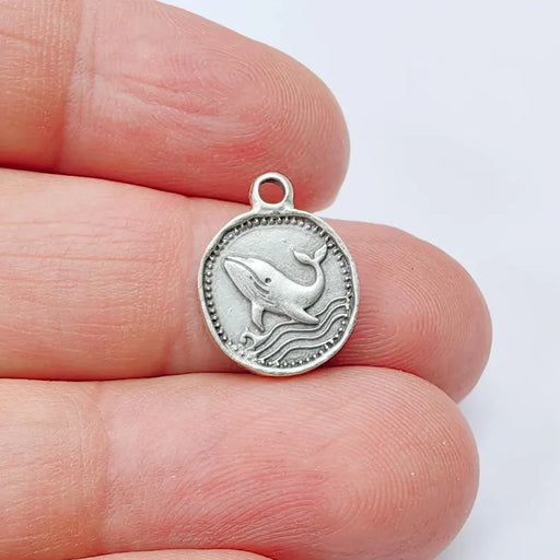 Antique silver plated whale charm featuring a detailed ocean-inspired design on both sides. This round pendant showcases a graceful whale above sty...