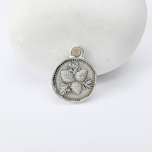 Antique silver plated pine cone charm featuring a detailed botanical design on both sides. This small round pendant showcases textured pine cones a...