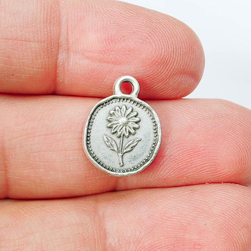 Antique silver plated daisy charm featuring a detailed botanical design on both sides. This small round pendant showcases a beautifully texture...