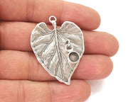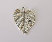 Leaf charm with round dangle cup bezel blank Antique silver plated brass charm (45x33mm) G25924