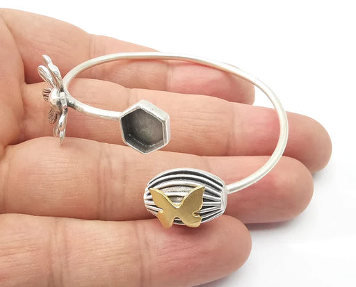 Hexagonal silver bracelet brass cuff blank bezel Glass cabochon base Adjustable antique silver brass G26154