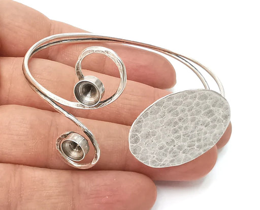 Disc hammered silver bracelet brass cuff blank bezel Glass cabochon base Adjustable antique silver brass G26161