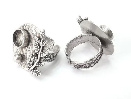 Hammered disc branch leaf blanks silver ring setting cabochon mounting adjustable ring base bezel Antique silver plated brass (8mm) G26234