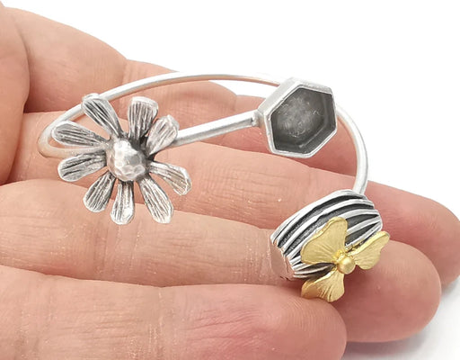 Hexagonal silver bracelet brass cuff blank bezel Glass cabochon base Adjustable antique silver brass (10 and 8mm) G26183