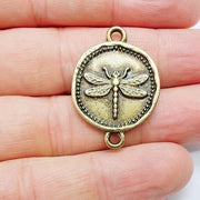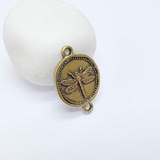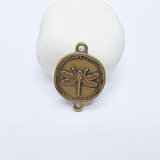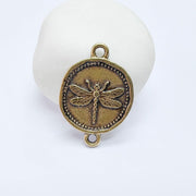 Antique bronze plated dragonfly charm connector featuring a finely detailed dragonfly motif set within a round, coin-style frame. The dragonfly symbolizes transformation, adaptability, and harmony with nature, making this double loop connector ideal for creating necklaces, bracelets, earrings, and nature-inspired or boho jewelry designs.