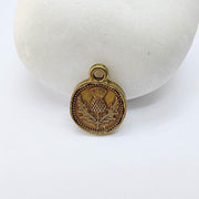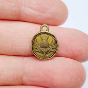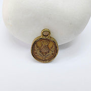 Antique Bronze plated Thistle Charm, double sided with a detailed floral design, perfect for bracelets, necklaces, earrings, and DIY jewelry projects.
