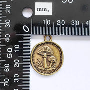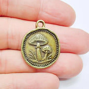 Antique bronze plated mushroom charm featuring a detailed botanical fungi design with two mushrooms set within a round coin-style frame. Inspired by forest, nature, and woodland themes, this charm adds an earthy and whimsical touch to handmade jewelry projects such as necklaces, bracelets, earrings, and charm collections.