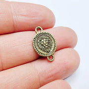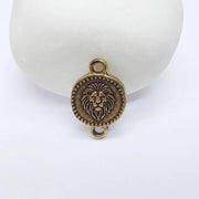 Crafted from high-quality zamac metal with an antique bronze plated finish, this charm offers a rich vintage tone with crisp relief detailing on both sides. The raised lion head motif and dotted border add depth and texture, while the connector-style loop design allows smooth integration between chains, beads, or other components. Its nickel free and lead free composition ensures safe use for everyday jewelry making.