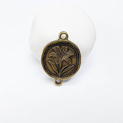Antique bronze plated lily flower charm connector featuring a delicately detailed lily bloom motif set within a round, coin-style frame. The lily flower symbolizes purity, renewal, and natural beauty, making this double loop connector ideal for creating necklaces, bracelets, earrings, and botanical or nature-inspired jewelry designs.