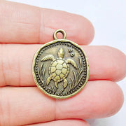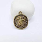 Antique bronze plated sea turtle charm featuring a detailed ocean animal design with a raised turtle motif framed in a round coin-style pendant. Inspired by marine life and coastal nature, this charm brings a calm and symbolic touch to handmade jewelry projects such as necklaces, bracelets, earrings, and charm collections.