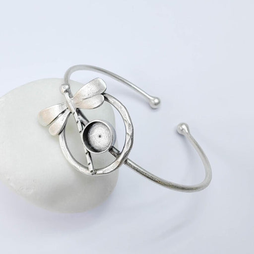 Dragonfly Bracelet, 8mm Bezel, Adjustable Brass Cuff, Antique Silver Plated, G37591