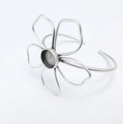 Create stunning custom jewelry with this antique silver-plated flower cuff bracelet base. Featuring an elegant open petal design and a central bezel setting, this adjustable bracelet allows you to personalize it with cabochons, resin, or gemstones. Perfect for jewelry enthusiasts and makers looking to add a floral touch to their collections. The durable construction ensures long-lasting wear, while the unique flower motif adds a blend of vintage charm and contemporary elegance. A versatile piece to elevate any jewelry project!