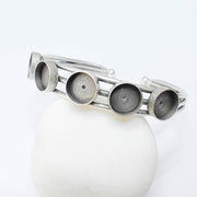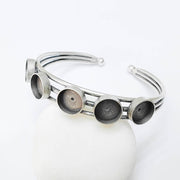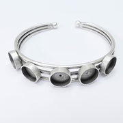 This adjustable bracelet base features five 10mm round bezels, ideal for creating elegant resin, cabochon, or gemstone jewelry. Its antique silver plated finish gives a timeless and sophisticated touch to your handmade designs.