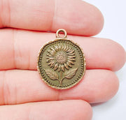 Sunflower Charm Pendant, Flower Earring, Floral Medallion, Botanical Jewelry Supply, Sunflower Necklace Antique Copper Plated 27x22mm G37253