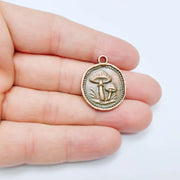 Antique Copper plated mushroom connector charm featuring a detailed botanical nature design with two mushrooms and grass elements. This round-shaped connector symbolizes growth, nature, and forest life, making it a distinctive choice for necklaces, bracelets, earrings, and nature-inspired handmade jewelry designs.