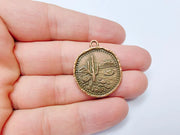 This round pendant showcases a detailed desert landscape with a cactus, mountain range, and rocky textures, all bordered with a dotted frame. With its antique copper plated finish and handcrafted feel, it's perfect for creating Western, boho, or nature-inspired jewelry designs.