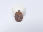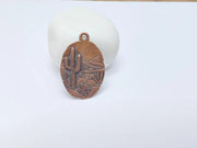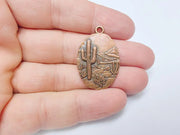 This round pendant showcases a detailed desert landscape with a cactus, mountain range, and rocky textures, all bordered with a dotted frame. With its antique copper plated finish and handcrafted feel, it's perfect for creating Western, boho, or nature-inspired jewelry designs.