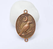 Add mystique and symbolism to your jewelry with this beautifully detailed moon raven connector. Featuring a perched bird under a crescent moon, framed by branches, this oval-shaped charm is perfect for mystical, nature-inspired or gothic jewelry pieces. Made from antique copper plated zamac, it includes two top and bottom loops for easy connection in necklaces or bracelets.