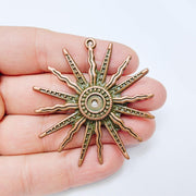 This large sunburst charm pendant features an expressive radiant sun design with elongated rays and detailed surface textures. Symbolizing energy, vitality, and warmth, this statement piece is ideal for handmade jewelry projects such as necklaces, wall talismans, boho accessories, and artistic charm creations.
