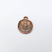 Antique copper plated Thistle Charm, double sided with a detailed floral design, perfect for bracelets, necklaces, earrings, and DIY jewelry projects.