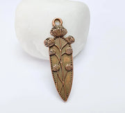 This antique copper pendant features a detailed thistle flower design etched onto a long, shield-shaped base. Symbolizing strength and resilience, the thistle brings a meaningful, natural touch to your jewelry. Perfect for rustic, boho, and nature-inspired creations. The antique copper finish adds a timeless, vintage appeal to necklaces and handcrafted accessories.