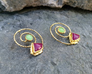 Spiral Earrings with Green and Claret Red Gemstones Gold Plated Brass SR53