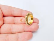 This adjustable ring bezel features a stunning combination of crystals and clear crystals surrounding a 16mm round bezel cup. The elegant 24K shiny gold finish enhances its luxurious look, making it perfect for custom jewelry creations with cabochons, resin, or gemstones.