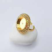 This adjustable ring bezel features a stunning combination of crystals and Rainbow crystals surrounding a 16mm round bezel cup. The elegant 24K shiny gold finish enhances its luxurious look, making it perfect for custom jewelry creations with cabochons, resin, or gemstones.