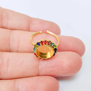 Colorful Crystal Ring Bezel, Adjustable Ring Base, 10mm Round Bezel Setting, 24K Shiny Gold, G37439