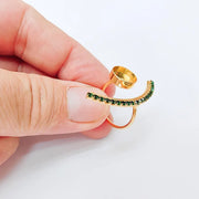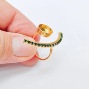 This adjustable ring bezel features a modern curved arm set with green crystals and a 10mm round bezel cup—perfect for cabochons, resin, or custom designs.