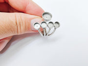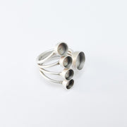 This adjustable multi-bezel ring features an elegant layered design with four 6mm and one 10mm round bezel settings, perfect for creating custom jewelry with cabochons, crystals, or resin art. Its modern yet handcrafted appearance makes it ideal for unique and artistic jewelry designs.