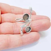 This adjustable ring blank features a delicate branch and leaf design with two 8mm round bezels. The botanical structure wraps elegantly around the finger, creating a natural and artistic jewelry base perfect for cabochons, resin, stones, or handmade inserts.