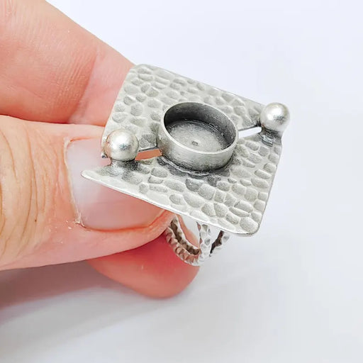 This adjustable ring base features a hammered square design with round ball details and a 10mm bezel setting, perfect for cabochons, resin, or crys...