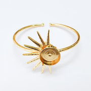 This adjustable cuff bracelet features a radiant sunburst design with a central 14mm bezel cup, perfect for setting cabochons, resin, or crystals. Its bold and eye-catching style makes it an excellent choice for statement jewelry designs.