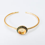 This adjustable cuff bracelet bezel features a 10mm round setting framed with green blue crystal accents, offering a refined and elegant touch for custom jewelry projects. The 24k shiny gold plating creates a luxurious contrast with the deep turquoise blue stones, making this bracelet perfect for statement and designer pieces.