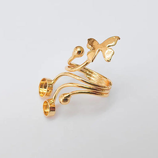 Butterfly Adjustable Ring Bezel, Floral Ring Base, 6mm and 8mm Bezel Cups, 24k Shiny Gold Brass, G37383