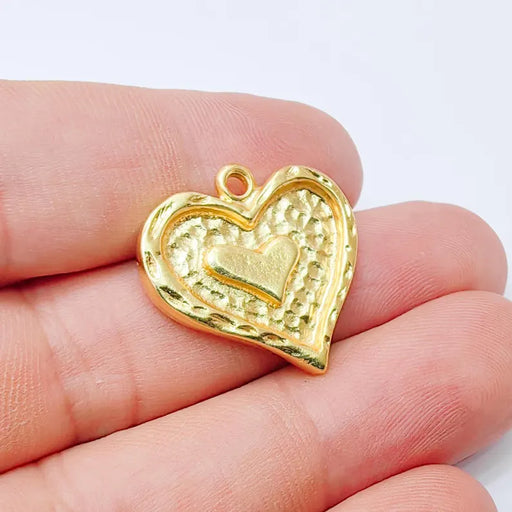 Charm Heart Pendant featuring a double heart design with a hammered texture, plated in shiny gold for a radiant finish. Crafted from zamac metal, ...