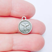 Antique silver plated Whale Tail Charm, double sided with a detailed ocean wave design, perfect for bracelets, necklaces, earrings, and DIY nautical jewelry projects.