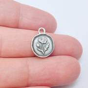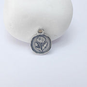 Antique silver plated Poppy Flower Charm, double sided with round floral design, a detailed pendant perfect for necklaces, bracelets, earrings, and DIY jewelry projects.