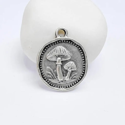Antique Silver plated mushroom charm featuring a detailed botanical fungi design with two mushrooms set within a round coin-style frame. Inspired b...
