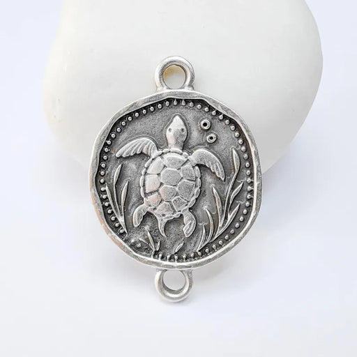 Antique Silver plated sea turtle charm connector featuring a finely detailed sea turtle motif set within a round, coin-style frame. The sea turtle ...