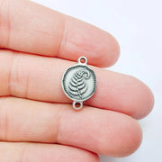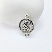 Antique silver plated fern leaf connector charm featuring a detailed botanical nature design inspired by forest, plant, and natural motifs. This oval-shaped, double-sided charm is ideal for creating necklaces, bracelets, earrings, and nature-inspired or boho-style handmade jewelry designs.
