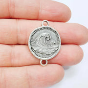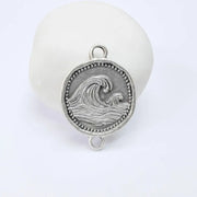Antique silver plated ocean wave connector charm featuring a dynamic sea-inspired design with flowing wave details. This round-shaped connector symbolizes strength, movement, and freedom, making it a striking choice for necklaces, bracelets, earrings, and ocean or nature-inspired handmade jewelry designs.